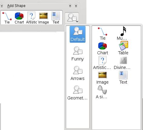 Just as important, because Add Shapes lists ties, charts, artistic text and pictures as possible selections, it reinforces the fact that all these possibilities are essentially the same kind of object so far as KOffice is concerned, and all can be manipulated in much the same way in the editing window. In other words, the Add Shapes docker makes clear a unifying concept in a way that separate sub-items in a menu or a collection of unconnected icons could never hope to match.