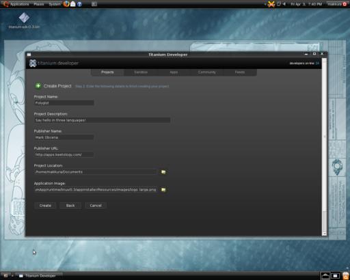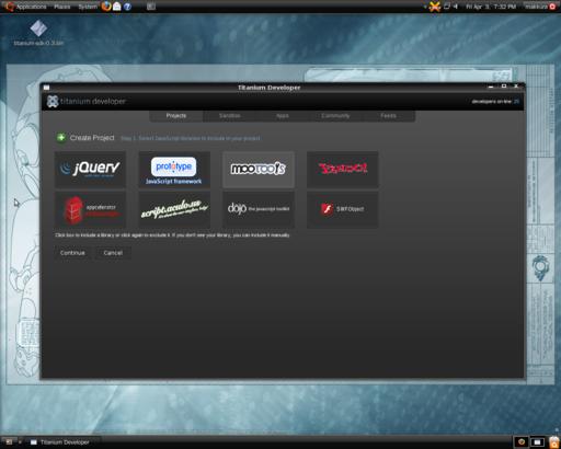 It's easy to create new projects using Titanium Developer. The Projects tab takes you step by step into creating a new project. The first step asks you which JavaScript libraries you'd like to add to your project. You can add libraries by clicking on their logos, and you also can opt out by not clicking any. For this example, try adding MooTools.