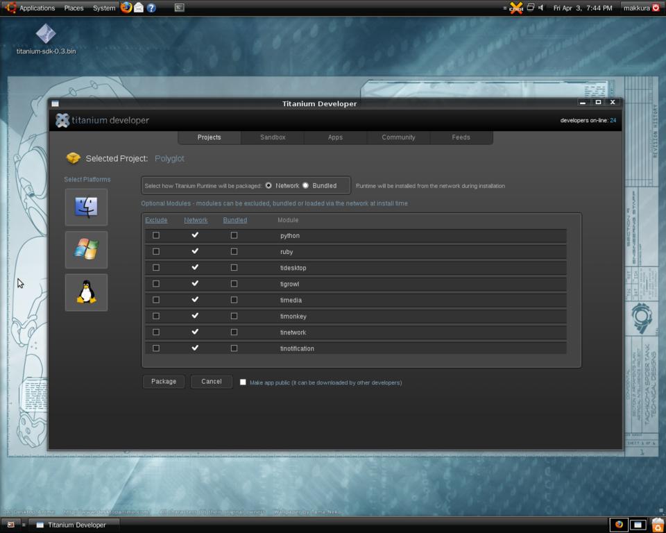 Finally, you have the choice of making your project publicly available. By checking Make app public, your application will be added to the App directory and be made available to users everywhere. This helps immensely in distributing your application, because Titanium also hosts your files for you. When you're done, click Package.