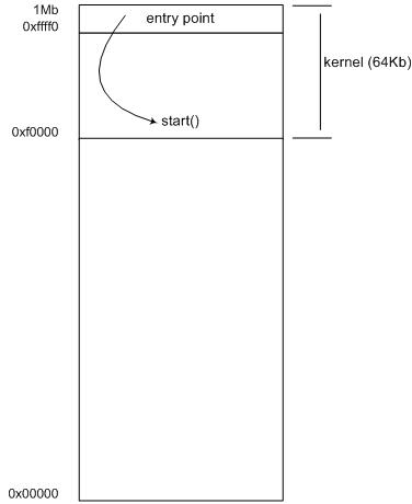 We now can write a kernel in assembler with its first instruction at offset 0xFFFF0. Note that unlike many processors, the x86 processor does not have a reset “vector”. It does not use the value at 0xFFFF0 as the location of the reset code; rather, it begins executing the code that is at 0xFFFF0. Therefore, the “normal” code to place at 0xFFFF0 is a jump to the actual reset code.