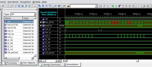 My extra circuit is shown in red in Figure 6: a counter and decoder that detect when the PicoBlaze is driving the LCD data port (lcd_d) and send different characters to it. The VHDL source code corresponding to this extra hardware is shown in Listing 1, which is not the complete, working VHDL file I used, but only an excerpt meant to give you an idea of how HDL coding works.