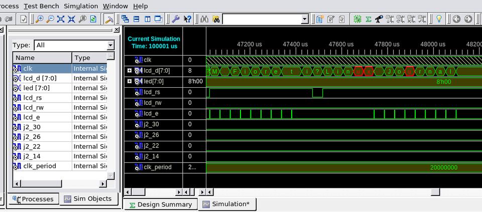 Lines 1–12 define input and output ports of the top-level circuit, the reading_dna module. You must declare all internal registers and wires before using them (lines 17–23). HDLs support hierarchy; you can instantiate other modules by declaring them and connecting all their ports to the right signals (lines 26–49). Line 53 shows a first example of a synchronous process. Depending on the value of the cnt_ops counter, whenever there is a positive edge of the clock (line 56) and the processor sets the signals write_strobe and port_id(6) high, the lcd_output_data register loads the character from the processor or the one from my extra logic (lines 62–68). The cnt_and_new_chars process starting at line 80 does the real work. First, it samples the LCD enable signal to count (line 91) the write accesses to the LCD. One cycle after a write occurs, working with the new counter value (line 99), the process calculates the next current_character that should be displayed. If you look at lines 101–125 you'll see that, instead of the DNA number, the display should show the ASCII string “M Fioretti Linux Journal”. A quick simulation (Figure 7) proves that the new process sends those characters to the display at the right times—that is, when the lcd_rs signal is high (low would indicate LCD configuration commands).
