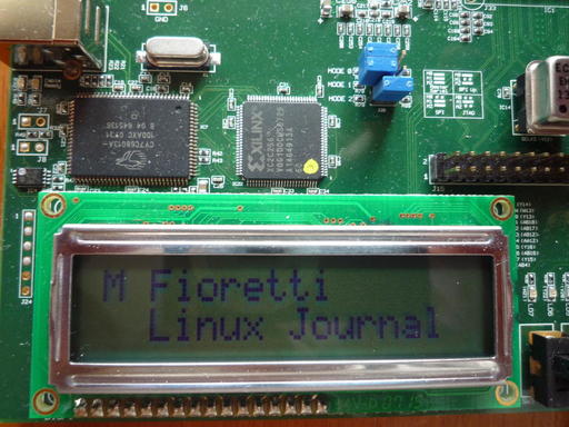 My modification consists of a small extra circuit that overwrites the default intro string on the fly with one saying “M Fioretti Linux Journal”. Be warned that this is a hack made only for demo purposes. In the real world, if you actually needed to change that string, it would make much more sense to rewrite the PicoBlaze assembly code. Because this is an article about HDL design in FPGAs, however, I went for a solution based on easy-to-read HDL code whose effect is easily visible in one picture.