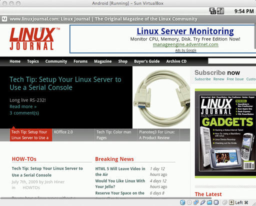 Once my Android VM was up and running, I started playing with it. Unlike the HTC Touch Pro port, this port had full networking. The first thing I did was fire up the browser (Figure 5) and was that ever surprising! It's possibly the fastest browser I've ever seen. Granted, it's optimized for a 500MHz ARM, and I was running it on a 2GHz dual-core CPU, but it was lightning fast. It's still a mobile browser, however, so it's not full-featured by any stretch of the word.