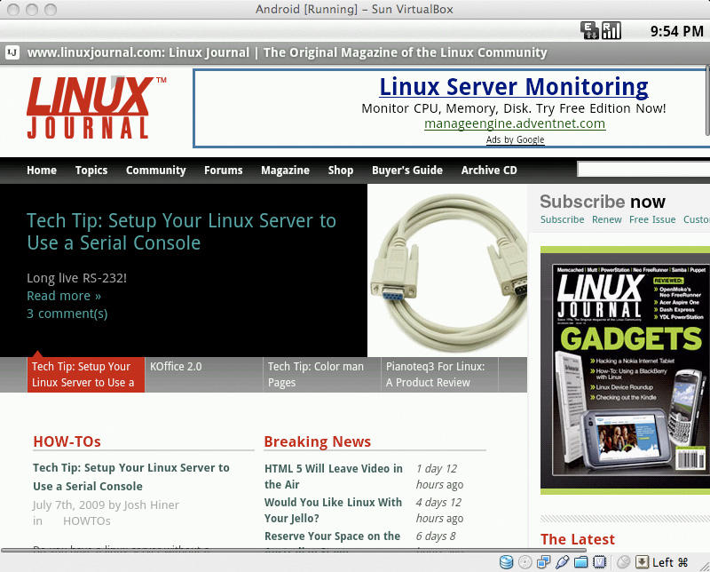However, aside from surfing the Web, mobile style, and playing with the Terminal application, there wasn't much of interest with Android on a VM. The applications aren't compelling enough to run there. As I had it built on a VM, I tried to port that to my Aspire One to see any performance differences, but there were enough hardware incompatibilities that I reached the point of diminishing returns. I figured I'd learned enough from the virtual machine, and going through another round of extensive troubleshooting just wasn't worth the effort.