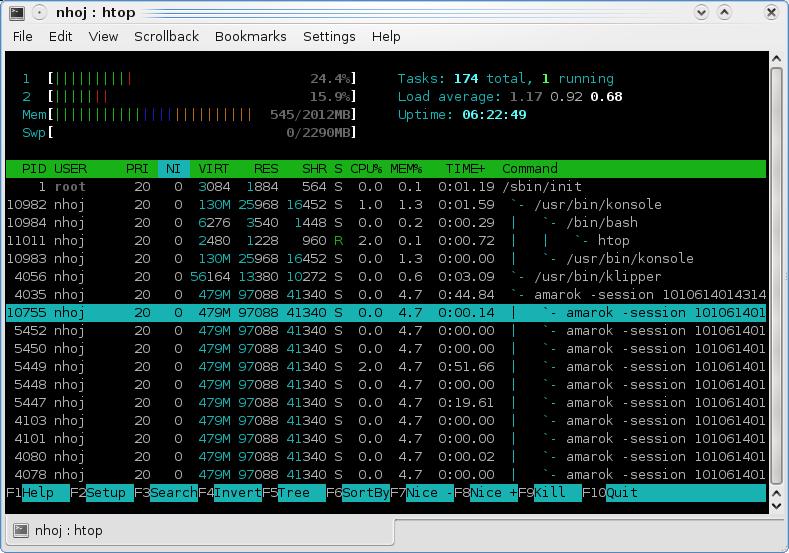 You can kill multiple jobs by pressing the spacebar on each one. The Search function is mapped to F3, allowing you to search for any part of text in the name of the process you're chasing, which comes in handy particularly for overburdened systems with too many processes. The SortBy function, mapped to F6, also is of great help, especially when you want to sort between system- and user-owned processes. And, the Tree function, mapped to F5, is fantastic for seeking things like tricky child processes. This program is fairly loaded with features, so it's worth checking the htop man page and the help screen (assigned to F1) for more information.