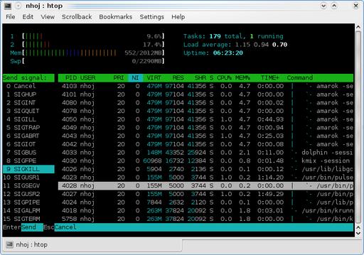To get started, you can browse through your processes with the arrow keys along with Page Up and Page Down. If you want to kill or tinker with a process, press either K or F9. At this point, htop brings up a menu of possible signals to send the program, with SIGTERM being the default choice. Scroll through these if you want to play with more-advanced features, but for most users, just pressing F9 and Enter will do the job fine.
