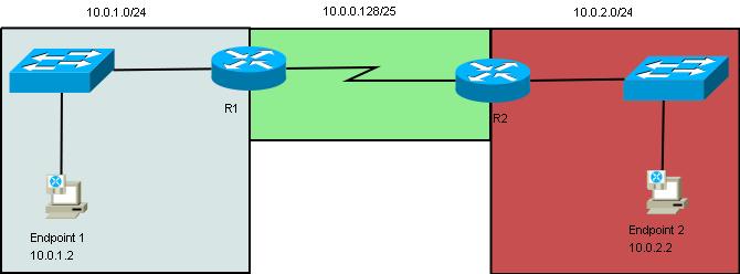 In this scenario, let's say we have anycast running between two sites (for instance, a main office and a satellite office) connected over a WAN. There is one anycast endpoint at each site. The main office is 10.0.1.0/24, the satellite office is 10.0.2.0/24, and our anycast address is 10.0.0.1, from our anycast subnet, 10.0.0.0/25 (Figure 1).