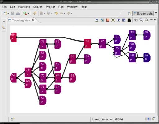 Figure 3. Streamsight is the administrative view of the running InfoSphere Stream. It allows people to visualize on which machines in the Linux cluster the various tasks are running, performance levels and other information. Each box represents a different type of analytic being run, and the lines represent data streaming between each task.