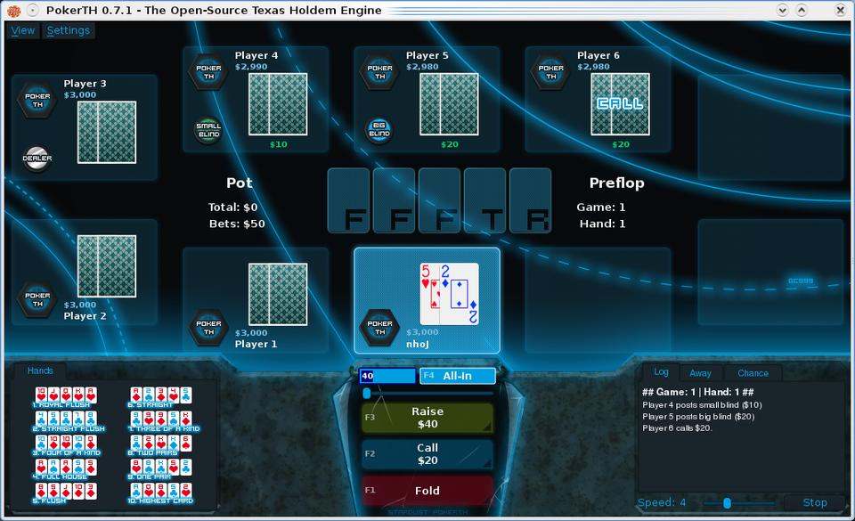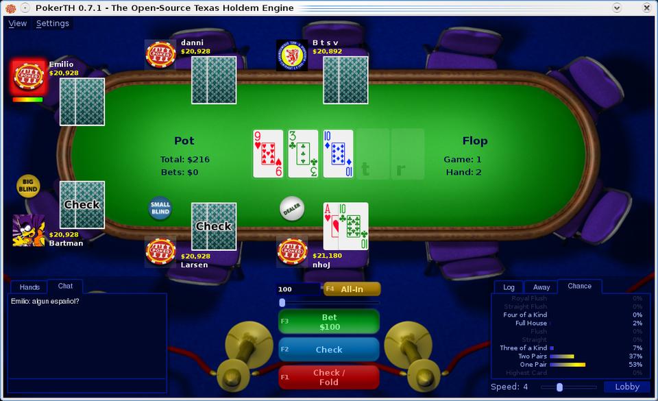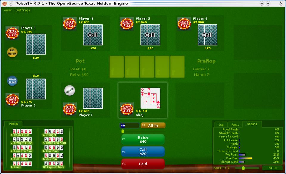 I'm sure Texas Hold'em fans will love PokerTH. Its use of open protocols, such as IRC, should help its longevity, and its large fan base is testament to this (I've never once had trouble finding a game on-line). It's a great poker sim for newbies and veterans alike, and I highly recommend it.