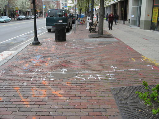 At the MIT end of Massachusetts Avenue in Cambridge, for a few blocks on either side of Central Square, the sidewalks are wider than two traffic lanes. The widest part, alongside the street, is paved with nice red brick. Much of the sidewalk is shaded by small trees planted in squares covered with four iron grates, each with a round bite off the inside corner, to make room for the tree. On the sidewalk and the road, the brick and asphalt are covered with spray-painted markings, in blue, red, orange, yellow, green and white. Roots under some of the trees are lifting and spreading the grates.