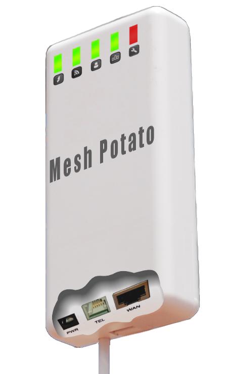 What do you call an 802.11bg mesh router with a single FXS port that automatically forms a peer-to-peer network and relays telephone calls without landlines or cell-phone towers? A Mesh Potato, of course.