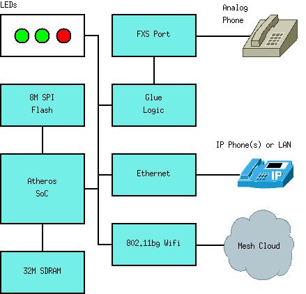 Figure 5 is a mud map of the Mesh Potato hardware. The Mesh Potato uses an Atheros AR2317 System-on-a-Chip (SoC), which is a very low-cost router chip that combines an MIPS processor running at about 200MHz with 802.11bg Wi-Fi. It has built-in interfaces for LEDs, SDRAM and serial Flash. Best of all, it is well supported by OpenWRT and MadWifi. The FXS hardware, drivers and other firmware we have developed are generic. It is possible to port them to other router architectures. In very high volumes, it would make sense to integrate the FXS chipset functionality onto the SoC.