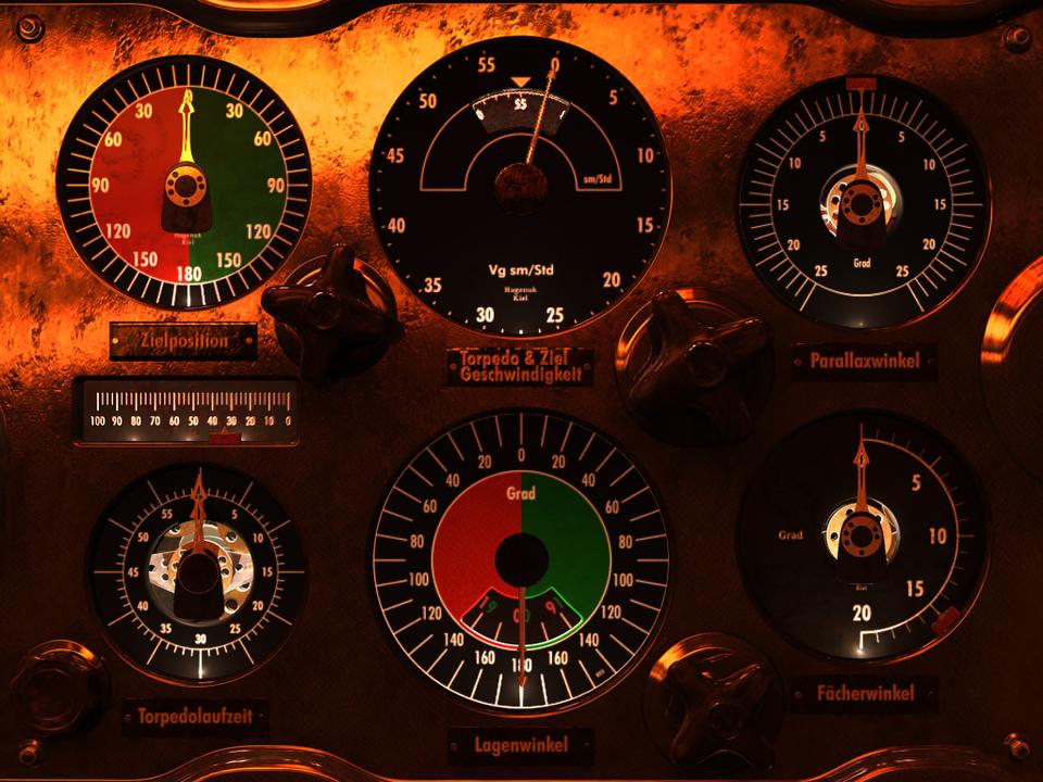 F1 through F12 all have a different view or function on the ship. Some keys bring you to actual locations within the submarine, such as the torpedo room or captain's quarters, and others bring up equipment, such as the ship's sonar. Of particular joy and amusement is the control screen on F1 and the torpedo screen on F6. The gauges and dials are in German, and as far as I know, there's no option to have them in English, so you'll have to find out what HalbeFarht and Lagenwinkel mean on your own.