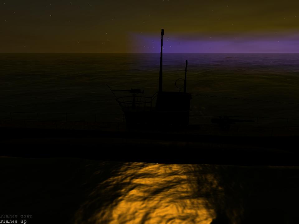 Press the S key to surface, and when you're up there, have a look around with various different view modes (check out that deck for starters, and, yes, you can man that surface gun). If a target is somewhere in sight, press I to identify the target. Pressing the spacebar selects it, and T fires a torpedo.