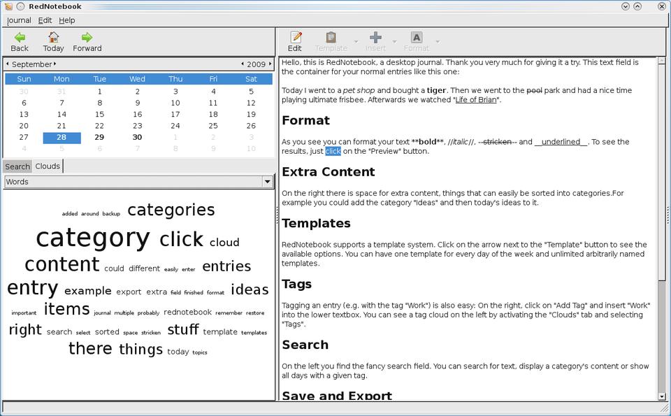 RedNotebook is a graphical diary and journal helping you keep track of notes and thoughts. It includes calendar navigation, customizable templates, export functionality and word clouds. You also can format, tag and search your entries.
