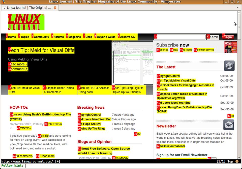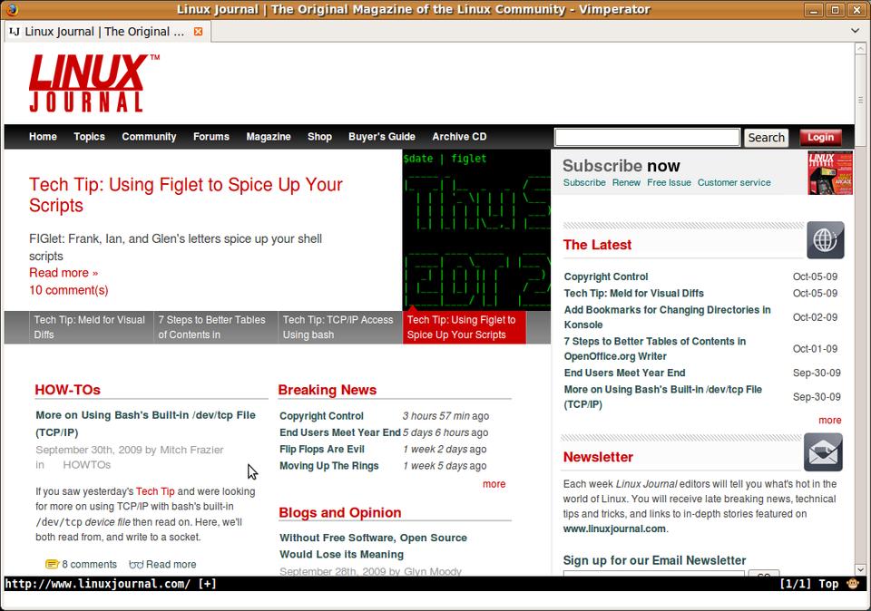 In November 2009, I wrote an entire column (“Dr hjkl and Mr Hack”) devoted to programs with vi-style keybindings. In the column, I introduced the Vimperator plugin for Firefox and discussed how it worked, but at the time, I mentioned, “The Vimperator plugin is extensive enough to deserve a column of its own (in fact, e-mail me at lj@greenfly.net if you'd be interested in that.)” Well, I received a number of responses, so between that and my love for all things with vi keybindings, I think it's worth giving the Vimperator plugin the full column it deserves.