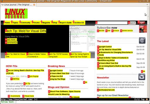 As I mentioned in my previous column, the main reason I love vi-style keybindings is that they keep your fingers on the home row (the asdfghjkl; row on your keyboard)—something quite important if you touch type. Once you get used to using hjkl to navigate documents, it and the rest of the keybindings become second nature. If you touch type with any decent speed, you realize how much it slows you down to reach for the mouse or even the arrow keys—particularly for something simple like clicking a link. Now, most Web browsers have some limited way to browse a page with a keyboard, but they almost always use the arrow and Page Up and Page Down keys, all of which are pretty far from the home row.