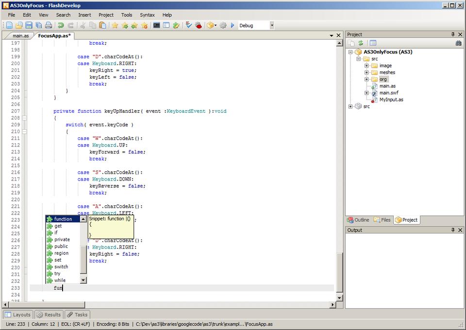 FlashDevelop is a free and open-source code editor designed for developing Flash applications. It supports code snippets, code completion, code navigation, code generation, bookmarks, task handling and syntax highlighting for ActionScript 2 and 3, MXML and haXe. It contains an integrated Project Manager and project templates to get your projects off the ground quickly.