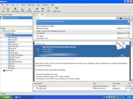 Figure 11. KMail, part of the KDE Kontact Personal Information Management suite, was able to connect to my mail server and download my e-mail.