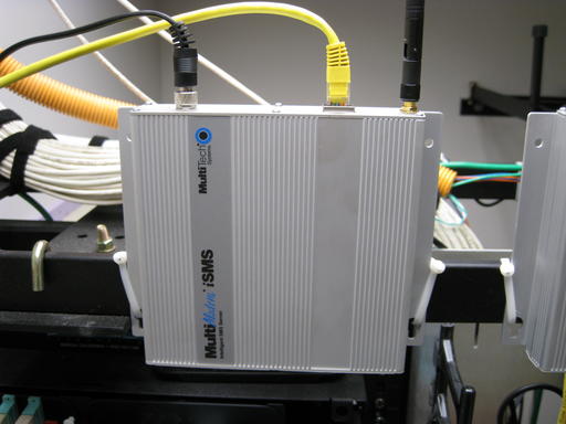 Other Nagios users are using conventional mobile phone handsets in this role, but I feel that consumer-level power supplies and some kind of jury-rigged mounting of a phone in a machine room would undermine the reliability I want. The iSMS has a robust metal case and can be attached securely to a rack. The power plug is threaded to the chassis to prevent accidental unplugging.