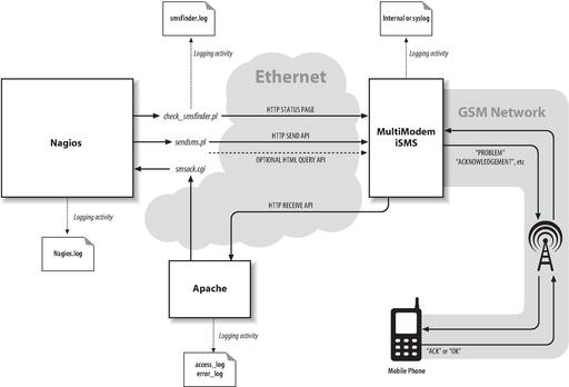 The most complicated use of the script is when it runs as the smsack.cgi CGI script under Apache. The recipient of an SMS alert can send the entire message back to the iSMS with the string “ACK” or “OK” prepended to the message text. When this SMS message is received by the iSMS, it uses the “HTTP Receive API” to call the smsack.cgi CGI script with the ACK message. The smsack.cgi CGI script parses the message text, determines whether it is a host or service being acknowledged, verifies that the sender's phone number is in the Nagios object cache and then uses the Nagios “external command” interface to signal Nagios. Nagios then tries to match the host or service name with one it knows about, and if this match is successful, it acknowledges the problem. The script also creates a note on the host or service page indicating that the problem was acknowledged by the sender's mobile number.