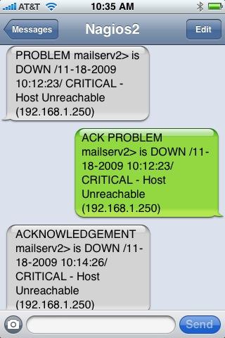 A major feature of the Perl script is the ability to “ACK” or acknowledge a Nagios alert. This means you don't have to have any kind of IP connection to your Nagios server to perform acknowledgements. The ability to acknowledge alerts is helpful when you are off the IP network, as it stops any future alerts and can prevent the alerts from going to others if you have configured Nagios to do this. The script also can force a service or host back to an “OK” state if desired.