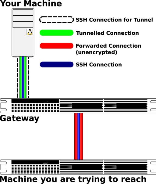 Figure 1 displays the example graphically. The initial ssh command builds the SSH connection for the tunnel, the tunneled connection and the forwarded connection. The second ssh command initiates a new connection through the tunnel and forwards the connection directly to the machine you are trying to reach. The forwarded connection is in red to show that it is unencrypted, but the blue SSH connection going through it is secure.