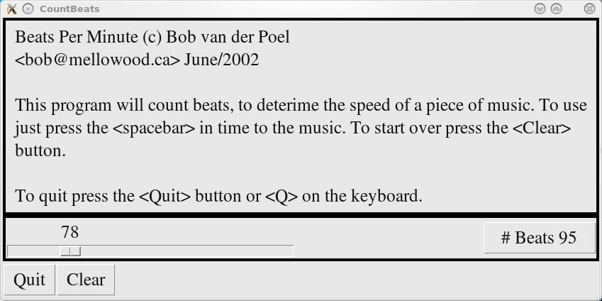 To use it, just invoke the program from the command line. You'll be presented with a screen describing the program, a time-bar, and a few buttons. Most should be self-explanatory. Just start tapping the spacebar in time to the music...the tempo bar will update and show how many beats per second are being played.