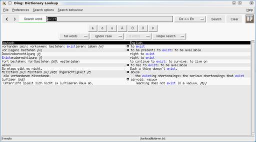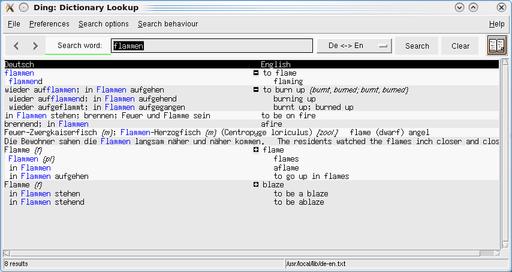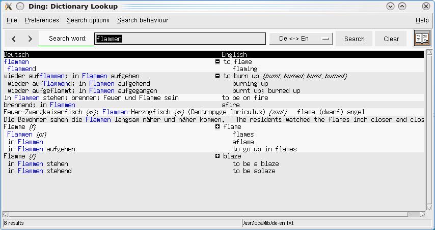 Ding is a dictionary lookup program for the X Window System on Linux/UNIX. It comes with a German-English dictionary with about 253,000 entries. It is based on Tk version >= 8.3 and uses the agrep or egrep tools for searching. In addition, Ding also can search in English dictionaries using dict(1) and check spelling using ispell(1). It has many configuration options, such as search preferences, interface language (English or German) and colors. It has history and help functions and comes with useful key and mouse bindings for quick and easy lookups.