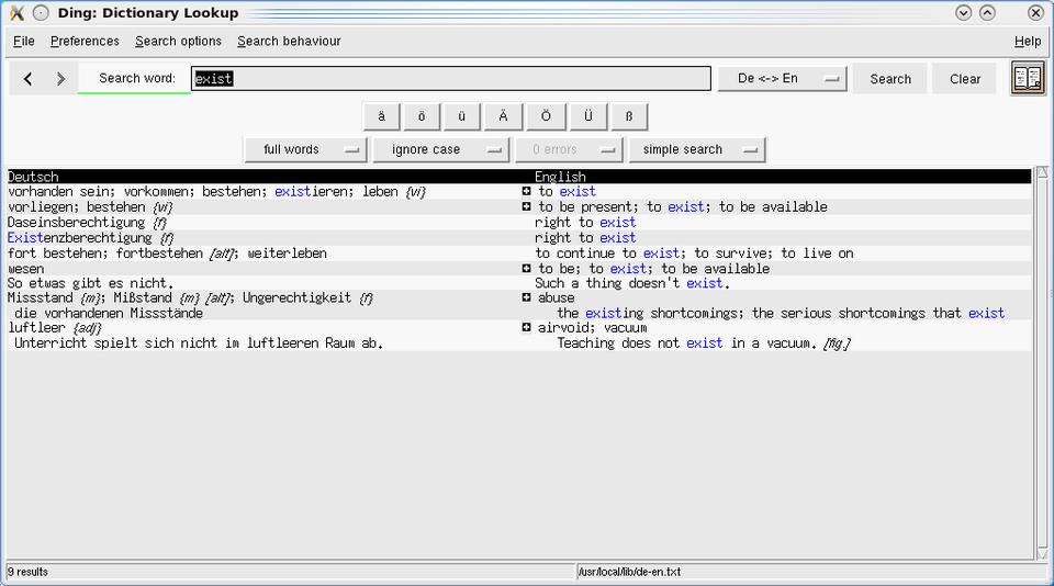 Are you a Rammstein fan trying to decipher those wacky lyrics or a Porsche fan trying to figure out exactly what Doppelkupplungsgetriebe means? Are you chasing a German-English translator that's simple to use and painless to install? This is probably the best place to start, especially if you have to type such accents as umlauts and the like (see what I mean further on). According to Ding's Freshmeat entry: