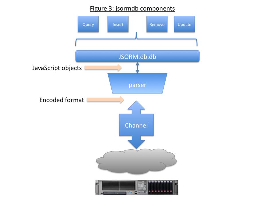 Putting it all together, you can create a database instance JSORM.db.db that retrieves data via HTTP from your server using JSORM.db.channel.http and parses it in JSON format using JSORM.db.parser.json. Figure 3 shows how all the pieces work together.