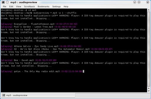 I love niche programs, especially in the area of multimedia. If you're like me, you probably have a folder full of MP3s and Oggs collected from the last ten years that's reached the point where you've forgotten half the files in there. This month, I stumbled upon the charming little command-line program, audiopreview. To quote the project's Freshmeat entry: