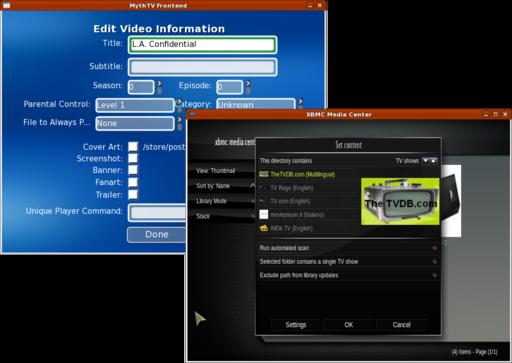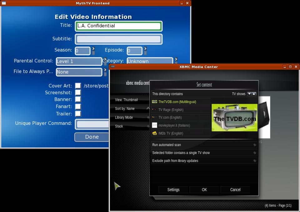 Information about videos is known as metadata. The metadata includes movie title, runtime, cast, synopsis and a variety of items similar to what is found on IMDB.com or TheMovieDatabase.org. Both applications can retrieve metadata automatically when new files are added to folders, and both allow you to edit this metadata while browsing the collection (Figure 10). XBMC offers multiple configurable sources for metadata on a per-folder basis. MythTV's metadata sources are dependent on configurable scripts, but only one script can be configured, and it applies to all files.