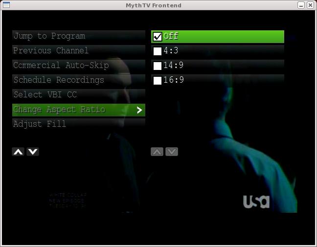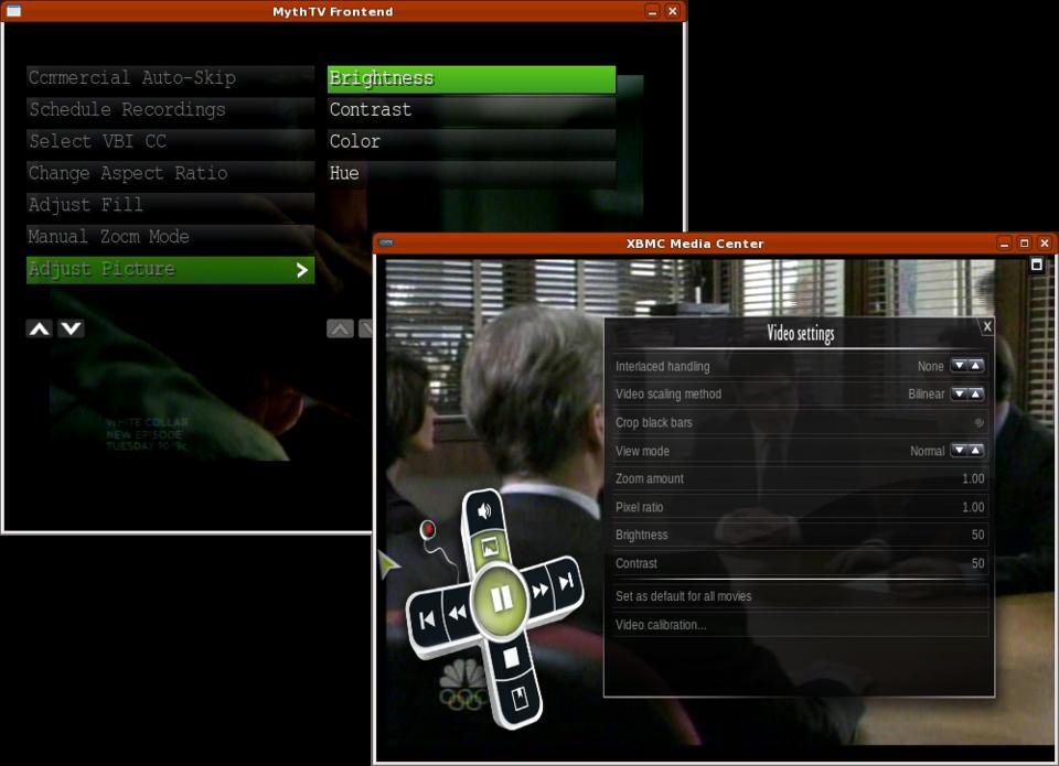 MythTV uses upfront configuration of window sizes and doesn't allow scaling the display while you watch. This isn't a problem once you're set up to display on a real TV, but if you watch on a desktop while you work, it's more of an issue. XBMC can display full screen, as does MythTV, but it also allows playing in a window that can be scaled while video is playing.