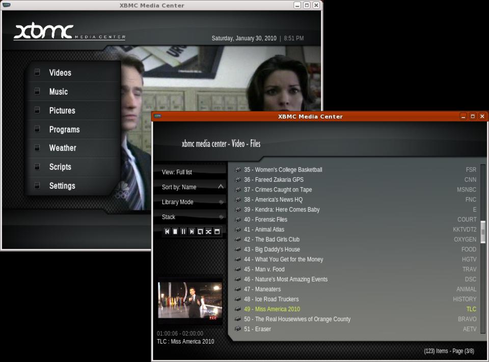 Figure 8. XBMC's Library mode displays scanned recordings, but File mode can access any remote source.