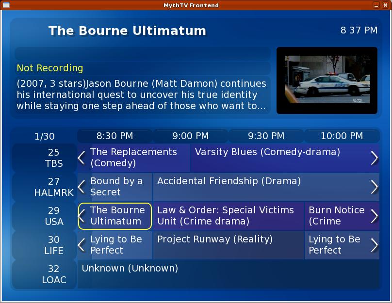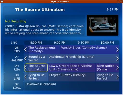 From the user perspective, TV playback under both systems is very similar to video playback. XBMC places TV as another source under its Video feature. MythTV separates videos from TV, although TV recordings still are under the TV function. The main difference between MythTV and XBMC is the way the guide is displayed. MythTV has a built-in guide that is updated by a back-end server (Figure 13). The guide is accessed from the OSD menu while watching live TV or when scheduling a recording.