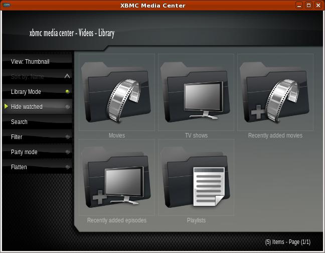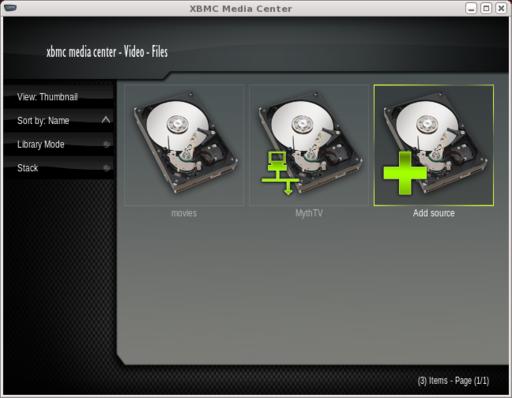 XBMC approaches video organization a little differently. First, it provides two browsing modes: file and library. File browsing starts by showing the available configured sources. Choosing one of those then presents a listing of options relevant to that source. For example, if one source is a set of videos on a local hard drive and another is a remote MythTV back end, the former lists the movies in a typical tree hierarchy and the latter shows features available from the server, such as live TV or recordings.