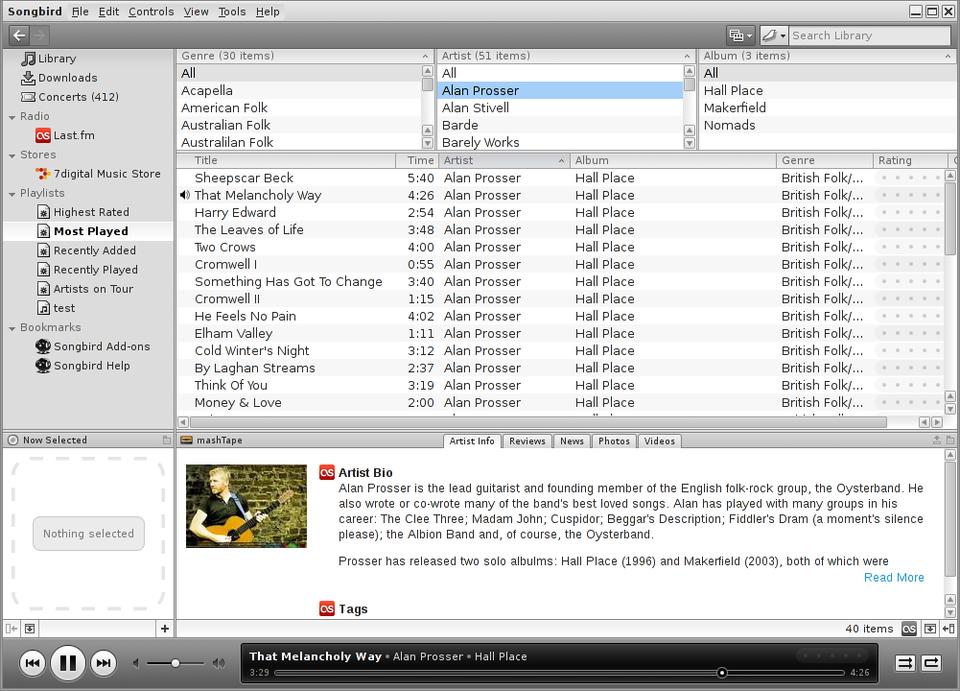 Instead, music players are starting to provide alternatives to liner notes using resources from the Internet. All five players can hunt the Internet for lyrics and covers, although with Rhythmbox, doing so requires enabling plugins. Exaile and Amarok also search for Artists and Albums, while Banshee bizarrely opts for a context pane that includes Top Albums and Top Tracks by the current artist—information that is minimally useful and more than a little imaginary the first few times you play tracks. However, taking a hard-core fan approach, Songbird outdoes the rest by searching for reviews, news, photos and videos.