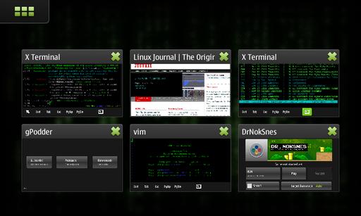 Along the top of the desktop is a bar that acts much like a panel on GNOME or KDE. On the top left-hand corner is a button you use to switch between desktops, an application launcher screen and an Expose-like application switcher that shows all of your currently running applications (Figure 2). This last feature is particularly well done and really makes the N900 stand out for its multitasking abilities. You also can press the Ctrl-Backspace shortcut keys to present the application switcher. It is very easy to switch between different programs.