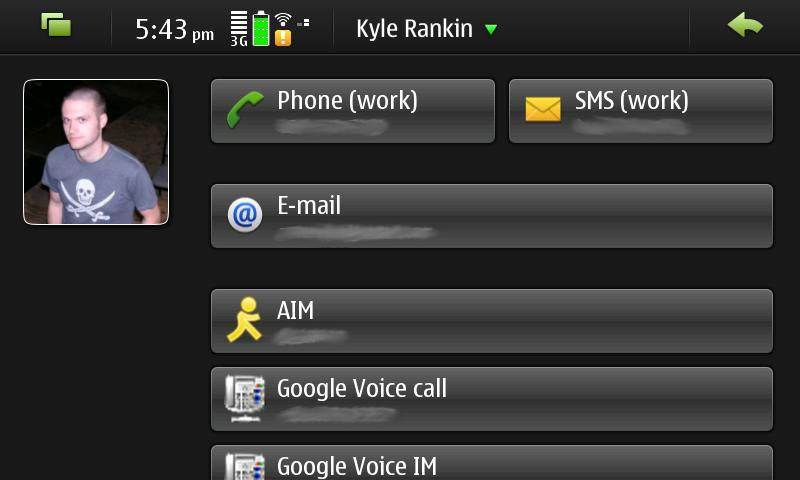 For instance, if I set my Skype account to be on-line, people in my contact list who were currently on-line would have a little green dot next to their contact, and if I had a contact shortcut on my desktop, it would be there as well. If I want to IM or call people via the Skype network, all I have to do is open their contact and click that particular option. If any of my friends send me an SMS or an IM, it shows up in a standard IM window. If they call my cell phone or Gizmo number or make a Skype call, the N900 rings the same way in each case.