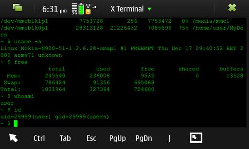 When I'm not using a Web browser on a Linux machine, I'm in a terminal, so the N900's terminal capabilities were important to me. The terminal is installed by default, so that's one mark in Nokia's favor. Also, there's a somewhat hidden shortcut of Ctrl-Shift-x that launches a terminal automatically. Granted, it's a bit tough to press that keyboard combo, but the fact that one exists at all shows that this environment doesn't ignore people who like to get their hands dirty on the command line.