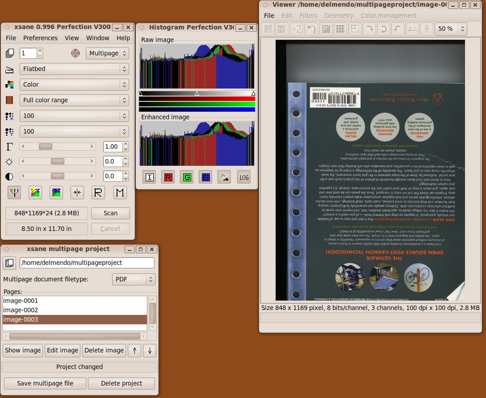 The first time I tried Simple Scan, it failed. That was a bit frustrating, but it was my own fault. I had xsane open at the same time. It turns out that each application claims ownership over the device. Once I closed xsane, Simple Scan worked like a champ. It really is simple, and it can do photos or text. Plus, it made making a multipage document as easy as just continuing to scan. xsane gives you incredibly fine-grained control. There probably are situations where I would be glad it includes a histogram of the image, but when all I am trying to do is sign a contract, scan it and e-mail a PDF, Simple Scan fits the bill.