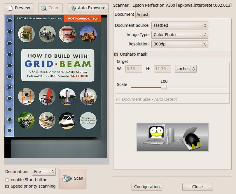 After a little more research, I ended up at Avasys. It provides drivers and a software utility for talking to my new scanner. I had to download a 64-bit deb for iscap and esci-interpreter. I clicked on Image Scan! for Linux, and the program told me it wasn't able to talk to the scanner. I was beginning to have flashbacks to the last time I tried using a scanner. Remaining calm, I power-cycled the scanner and tried the application again. This time, it started up without complaint. I was able to click Scan, and a scan of a book cover showed up. I was able to scan to several different file types: TIFF, JPEG, PNM, PNG and PDF. I was a little disappointed that the PDF option didn't allow me to store more than a single page in the file.