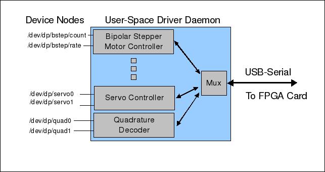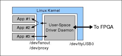 Doing 25 drivers in the kernel, although possible, would have required time and effort far beyond what the company could afford. The process of building kernel device drivers would have been even more complicated because the FPGA card connects to the Linux host over a USB-serial link. The solution, illustrated in Figure 1, is to have a dæmon manage the USB-serial port and demultiplex the various FPGA-based peripherals out to their own device nodes. The device nodes are little more than shims that let the high-level application deal with separate device entries for each peripheral.