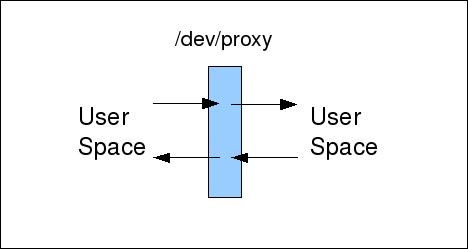 The idea is to have two very thin drivers that sit between the higher-level applications and the user-space driver. These are real drivers and appear as such to the higher-level software. The data exchanged between the application and the user-space driver passes as transparently as possible through the kernel. Even flow control passes transparently between the application and the user-space driver.