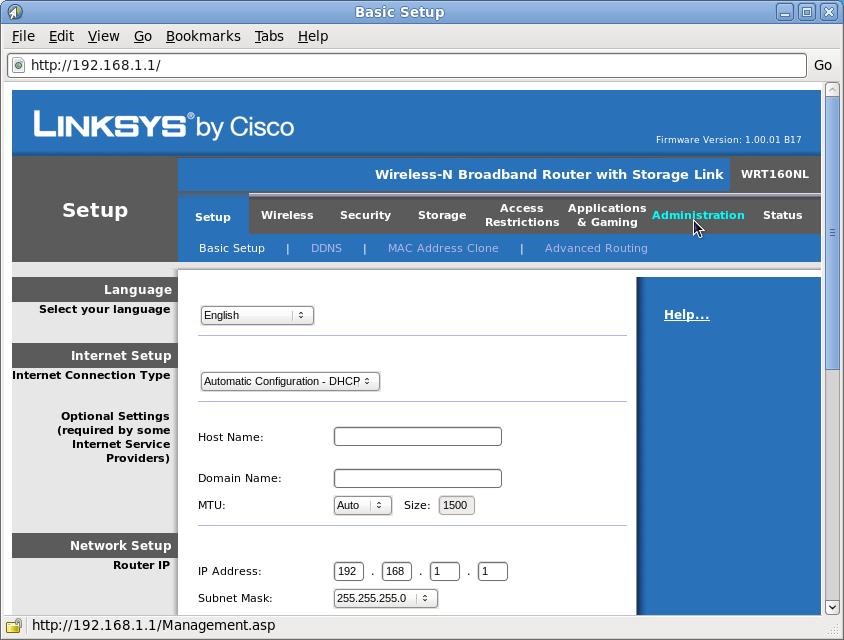 The result of the build process is a firmware image stored at bin/ar71xx/openwrt-ar71xx-wrt160nl-squashfs.bin. You may install the OpenWrt firmware onto your router using Linksys' firmware upgrade tool, assuming you have not already replaced Linksys' default firmware. The Linksys firmware provides a Web-based configuration (Figure 1). The Linksys firmware has a default IP address of 192.168.1.1, a default user name of “admin” and a default password of “admin”. After configuring your build workstation by adding it to the 192.168.1.0 network, point your browser to 192.168.1.1. Click Administration and then Firmware Upgrade. Finally, click Choose File, and select the firmware image you just built, namely openwrt-ar71xx-wrt160nl-squashfs.bin. Follow the directions on the screen to replace Linksys' firmware with the OpenWrt firmware. Restart the router once the upgrade process is complete.