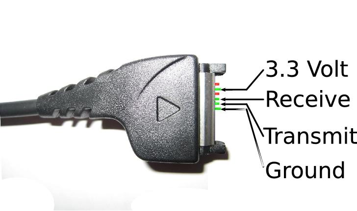 Figure 3 provides a picture of a Nokia DKU-5 cable connector. The other side of the cable has a USB connector. Cut the cable in half so that most of its length is on the USB connector side. Now, expose the six leads on the Nokia connector side. Use a continuity tester to identify which four of the six leads correspond to the functional pins noted in Figure 3. Note the insulator color of the lead connected to each pin. Now focus your attention to the other half of the cable, the one with the USB connector. Expose the four leads matching the colors noted earlier. Connect each of these leads to the four of five binding posts labeled in Figure 4, ensuring that the lead and post functions match. You may connect them using a PCB connector, hook to pico hook jumpers or a more primitive technique.