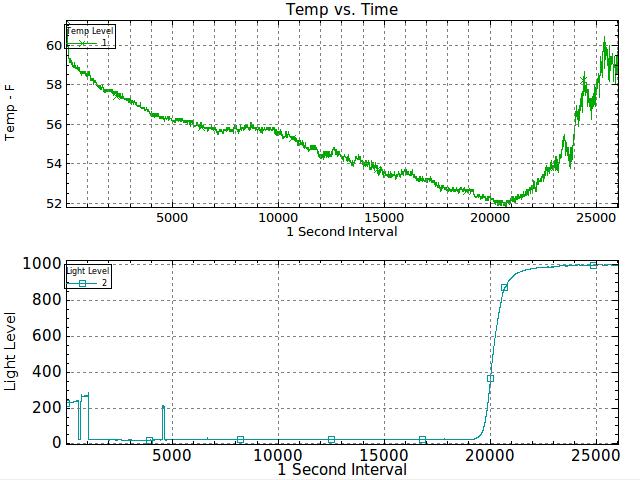 Below is a small segment of some temperature and light-level data that I captured. The data snapshot will be used to test kst. Later, this same format will be used to stream real-time data from the Arduino into our Linux machine. Copy the data into a text file named testdata.txt: