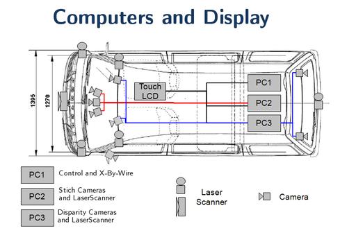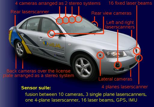 Alberto: The architecture is simple: seven cameras, five laser scanners, GPS, IMU (Inertial Measurement Unit)—all connected to three Linux PCs. The PCs get the data, process it and send commands to actuators that drive the steering wheel, gas and brakes. All the software was developed by us during the last 15 years. We have been using this software for other challenges like the DARPA Grand Challenge or Urban Challenge.